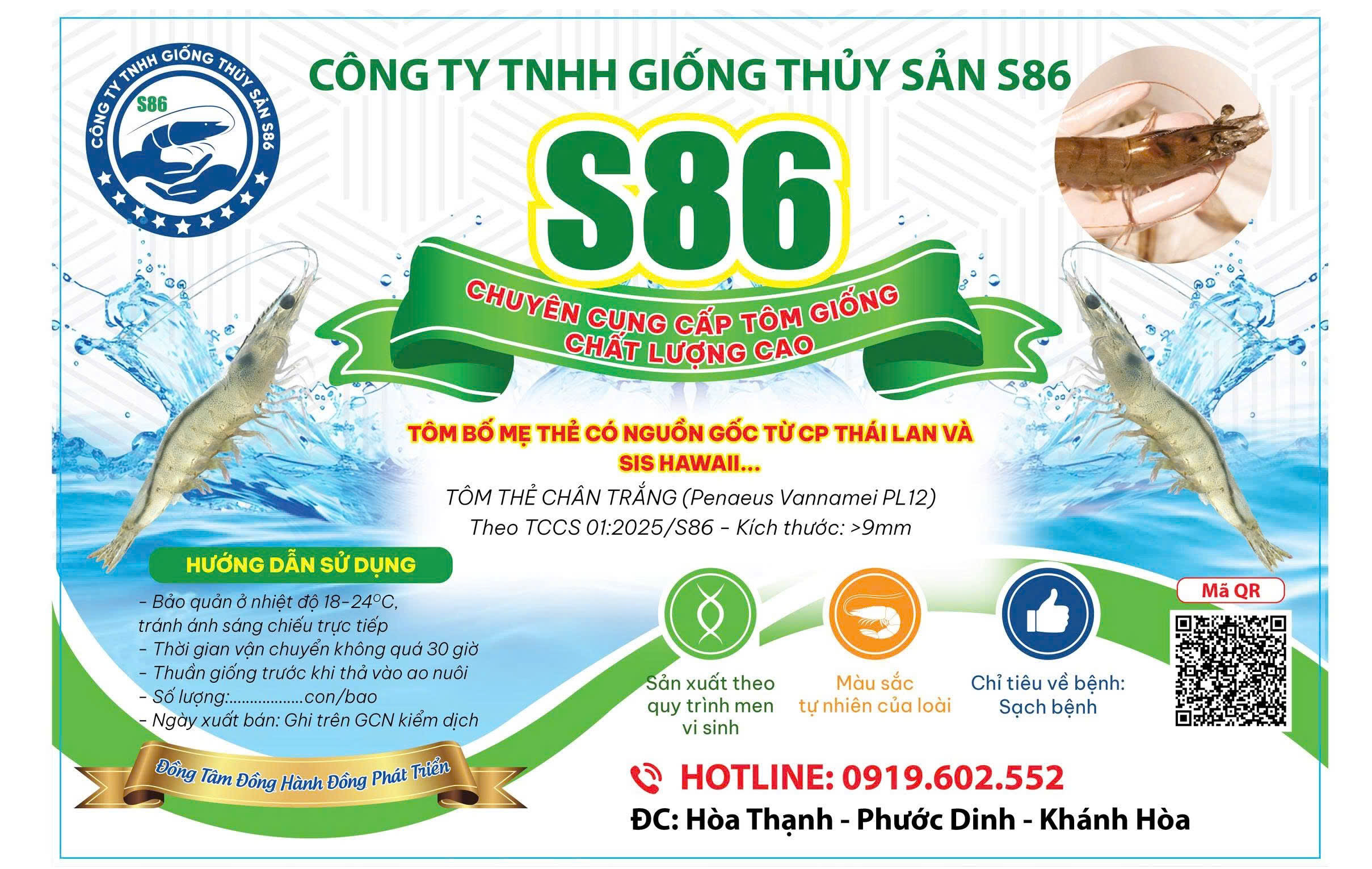 Tôm giống xuất trại đều được kiểm tra PCR nhiều lần, đảm bảo sạch bệnh các nhóm EMS, EHP, MBV và đốm trắng, đồng thời được tuyển chọn theo các tiêu chí: khỏe mạnh, bơi linh hoạt, đường ruột đầy và màu sắc trong sáng. Nhờ sự kết hợp giữa công nghệ hiện đại và đội ngũ kỹ thuật giàu kinh nghiệm, khu sản xuất cho ra đời những lô tôm giống chất lượng cao, đồng đều và ổn định — đáp ứng tốt cho cả mô hình thâm canh và siêu thâm canh.